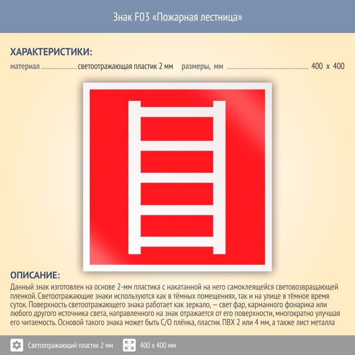 Знак F03 «Пожарная лестница» (светоотражающий пластик, 400х400 мм) в Альметьевске купить
