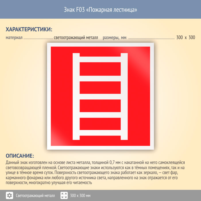 Знак F03 «Пожарная лестница» (светоотражающий металл, 300х300 мм) в Альметьевске купить
