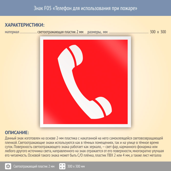 Знак F05 «Телефон для использования при пожаре (в том числе телефон прямой связи с пожарной охраной)» (светоотражающий пластик, 300х300 мм) в Альметьевске купить
