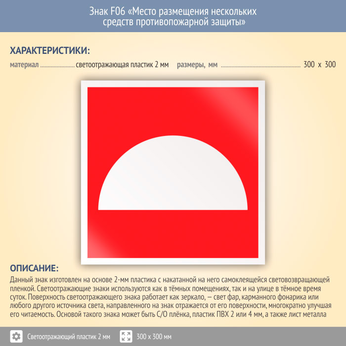 Знак F06 «Место размещения нескольких средств противопожарной защиты» (светоотражающий пластик, 300х300 мм) в Альметьевске купить