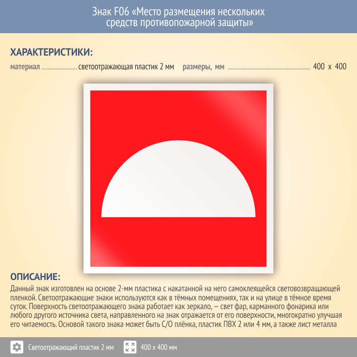 Знак F06 «Место размещения нескольких средств противопожарной защиты» (светоотражающий пластик, 400х400 мм) в Альметьевске купить