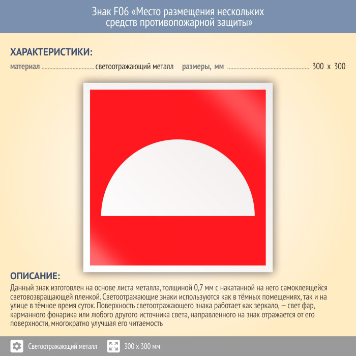 Знак F06 «Место размещения нескольких средств противопожарной защиты» (светоотражающий металл, 300х300 мм) в Альметьевске купить