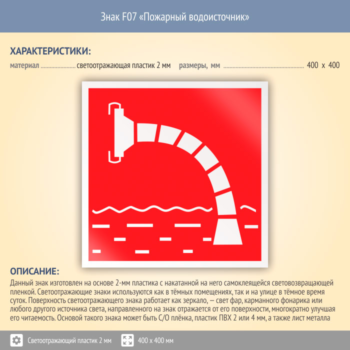 Знак F07 «Пожарный водоисточник» (светоотражающий пластик, 400х400 мм) в Альметьевске купить