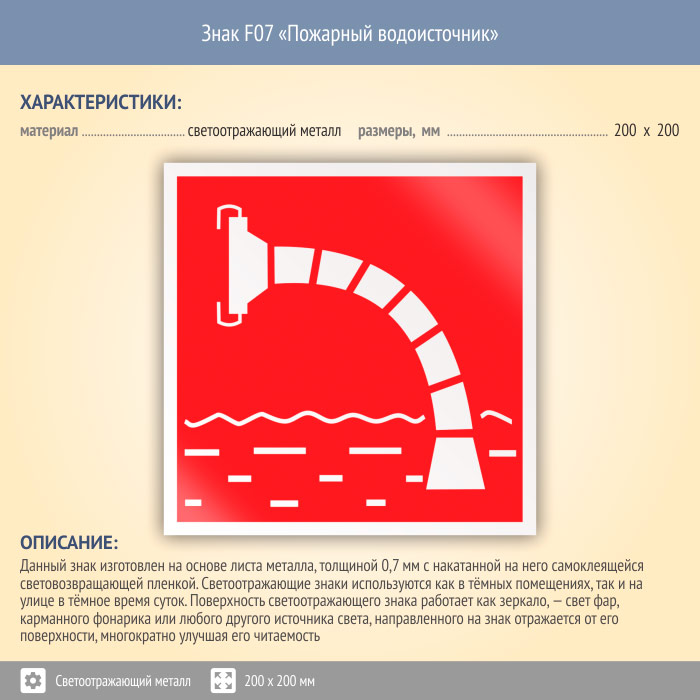 Знак F07 «Пожарный водоисточник» (светоотражающий металл, 200х200 мм) в Альметьевске купить