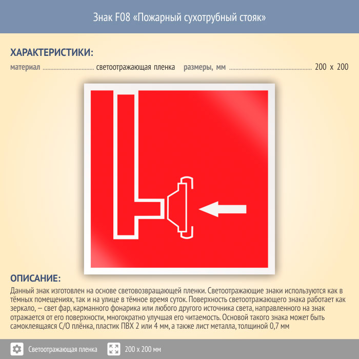 Знак F08 «Пожарный сухотрубный стояк» (светоотражающая пленка, 200х200 мм) в Альметьевске купить