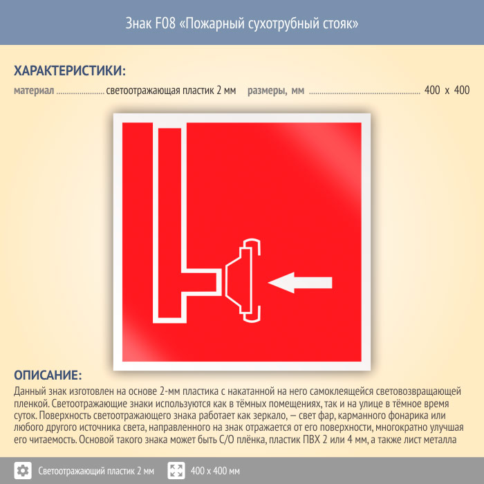 Знак F08 «Пожарный сухотрубный стояк» (светоотражающий пластик, 400х400 мм) в Альметьевске купить