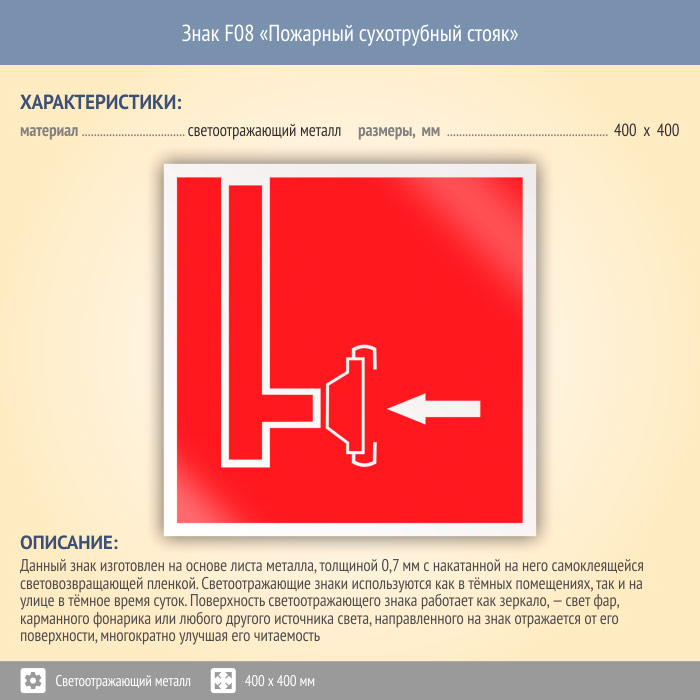 Знак F08 «Пожарный сухотрубный стояк» (светоотражающий металл, 400х400 мм) в Альметьевске купить