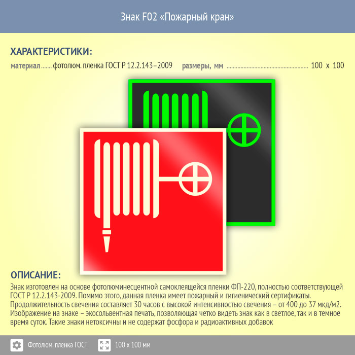 Знак F02 «Пожарный кран» (фотолюминесцентная пленка ГОСТ 34428-2018, 100х100 мм) в Альметьевске купить