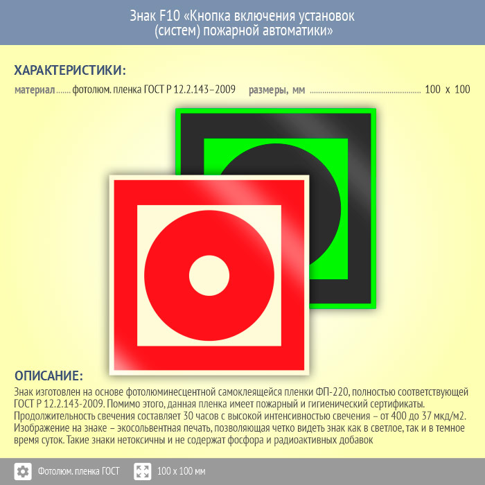 Знак F10 «Кнопка включения установок (систем) пожарной автоматики» (фотолюминесцентная пленка ГОСТ 34428-2018, 100х100 мм) в Альметьевске купить