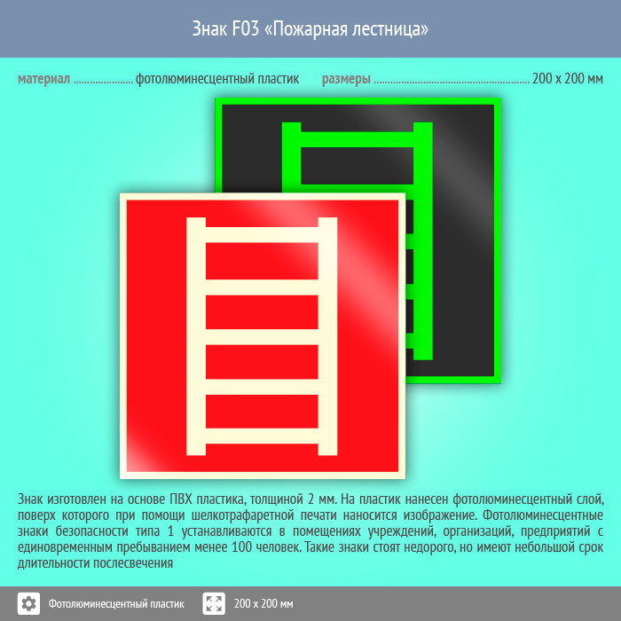 Знак F03 «Пожарная лестница» (фотолюминесцентный пластик, 200х200 мм) в Альметьевске купить