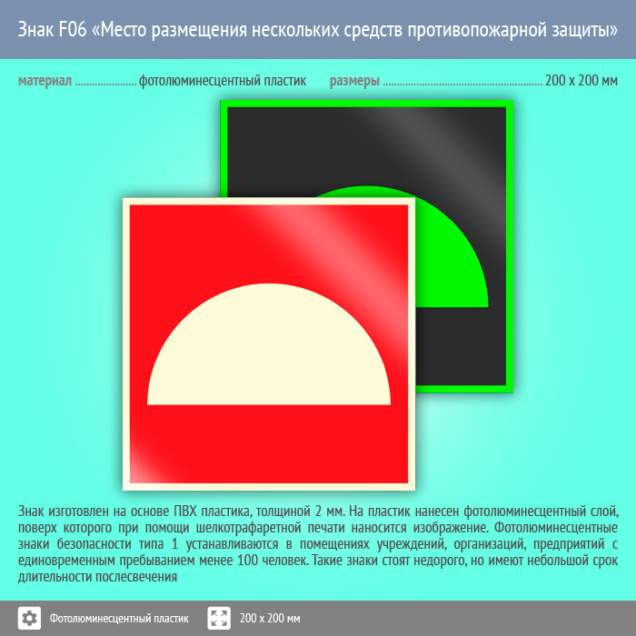 Знак F06 «Место размещения нескольких средств противопожарной защиты» (фотолюминесцентный пластик, 200х200 мм) в Альметьевске купить