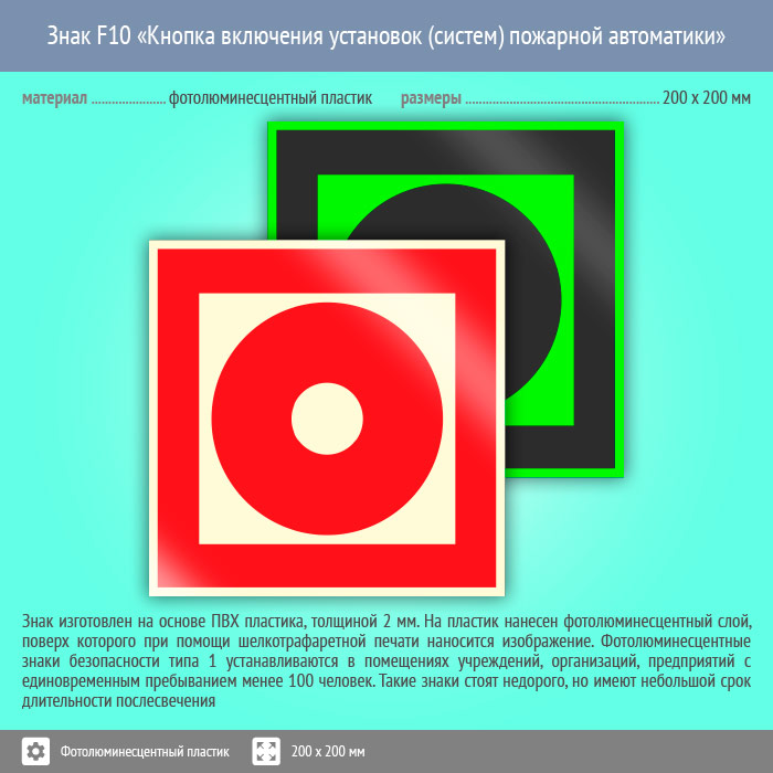Знак F10 «Кнопка включения установок (систем) пожарной автоматики» (фотолюминесцентный пластик, 200х200 мм) в Альметьевске купить