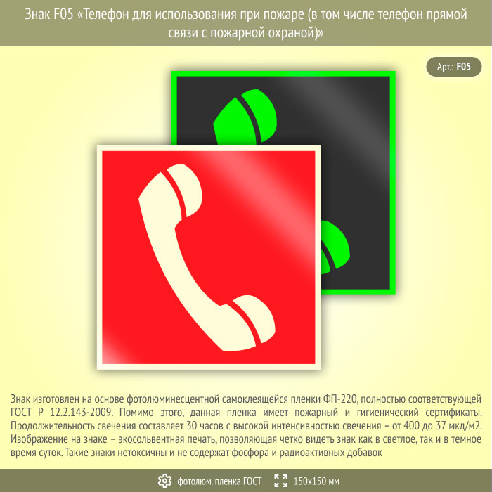 Знак F05 «Телефон для использования при пожаре (в том числе телефон прямой связи с пожарной охраной)» (фотолюминесцентная пленка ГОСТ 34428-2018, 150х150 мм) в Альметьевске купить