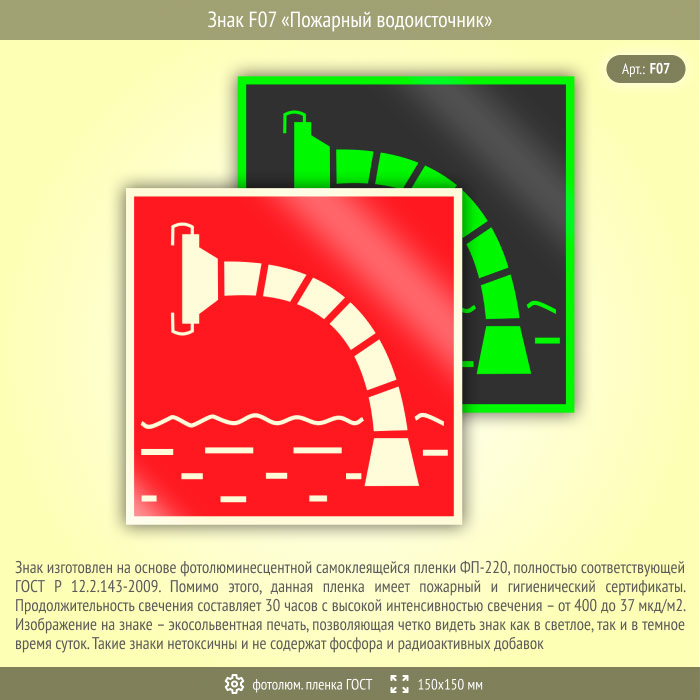 Знак F07 «Пожарный водоисточник» (фотолюминесцентная пленка ГОСТ 34428-2018, 150х150 мм) в Альметьевске купить