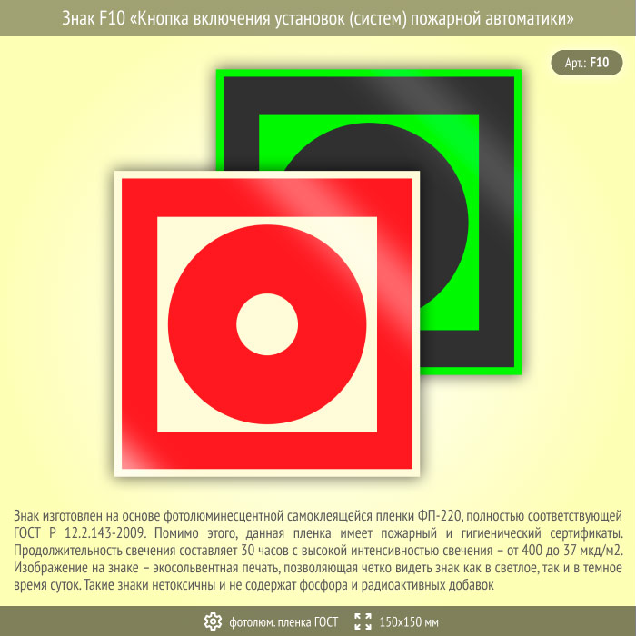 Знак F10 «Кнопка включения установок (систем) пожарной автоматики» (фотолюминесцентная пленка ГОСТ 34428-2018, 150х150 мм) в Альметьевске купить
