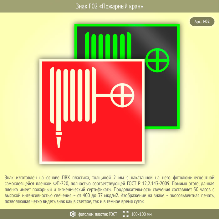 Знак F02 «Пожарный кран» (фотолюминесцентный пластик ГОСТ 34428-2018, 100х100 мм) в Альметьевске купить