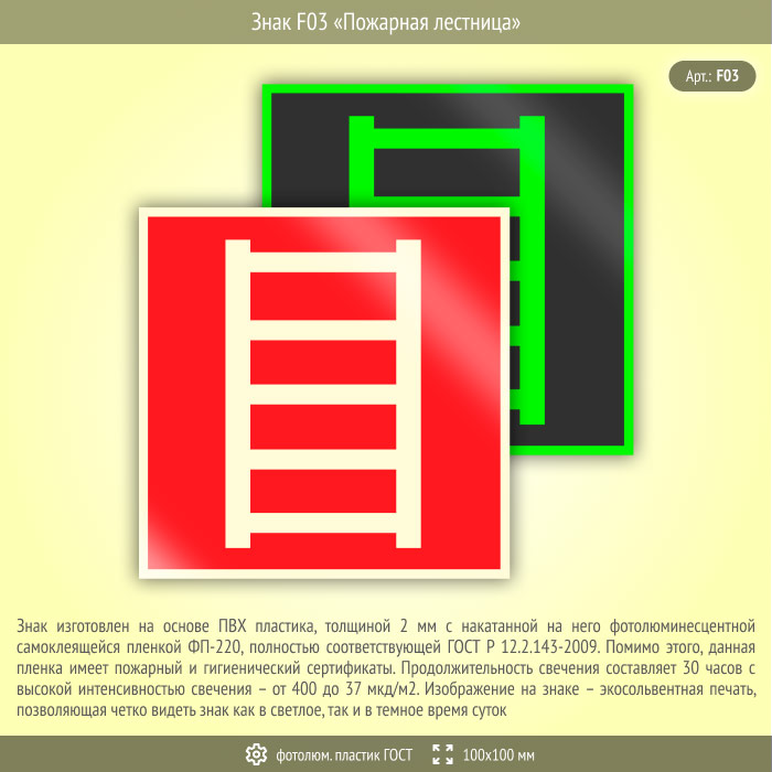 Знак F03 «Пожарная лестница» (фотолюминесцентный пластик ГОСТ 34428-2018, 100х100 мм) в Альметьевске купить