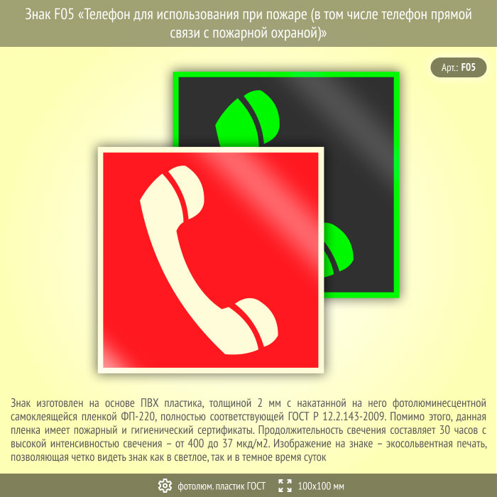 Знак F05 «Телефон для использования при пожаре (в том числе телефон прямой связи с пожарной охраной)» (фотолюминесцентный пластик ГОСТ 34428-2018, 100х100 мм) в Альметьевске купить