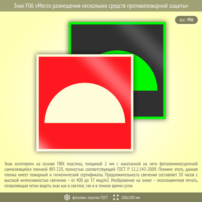 Знак F06 «Место размещения нескольких средств противопожарной защиты» (фотолюминесцентный пластик ГОСТ 34428-2018, 100х100 мм) в Альметьевске купить