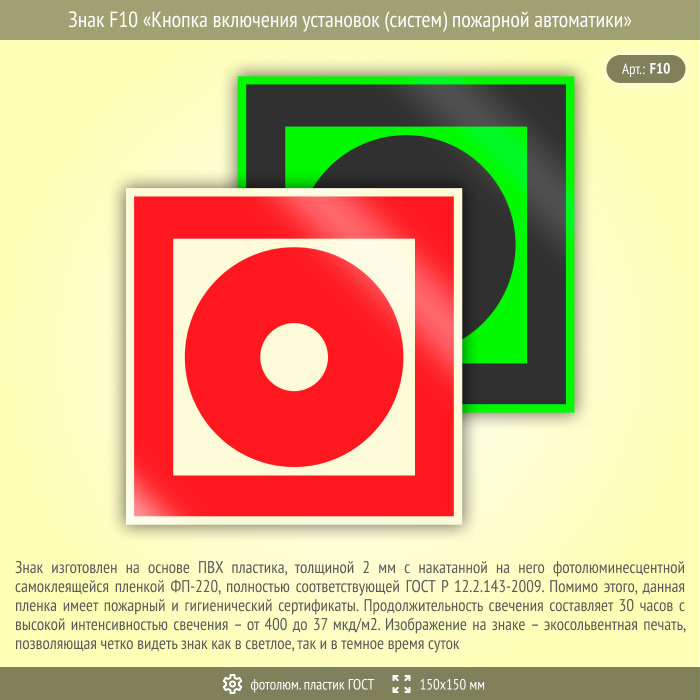 Знак F10 «Кнопка включения установок (систем) пожарной автоматики» (фотолюминесцентный пластик ГОСТ 34428-2018, 150х150 мм) в Альметьевске купить