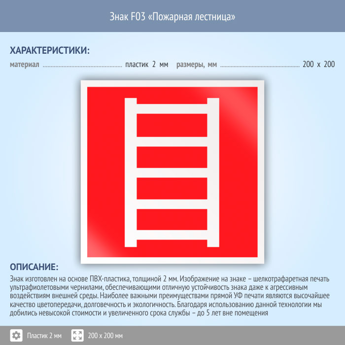 Знак F03 «Пожарная лестница» (пластик, 200х200 мм) в Альметьевске купить