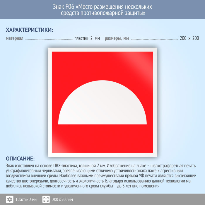 Знак F06 «Место размещения нескольких средств противопожарной защиты» (пластик, 200х200 мм) в Альметьевске купить