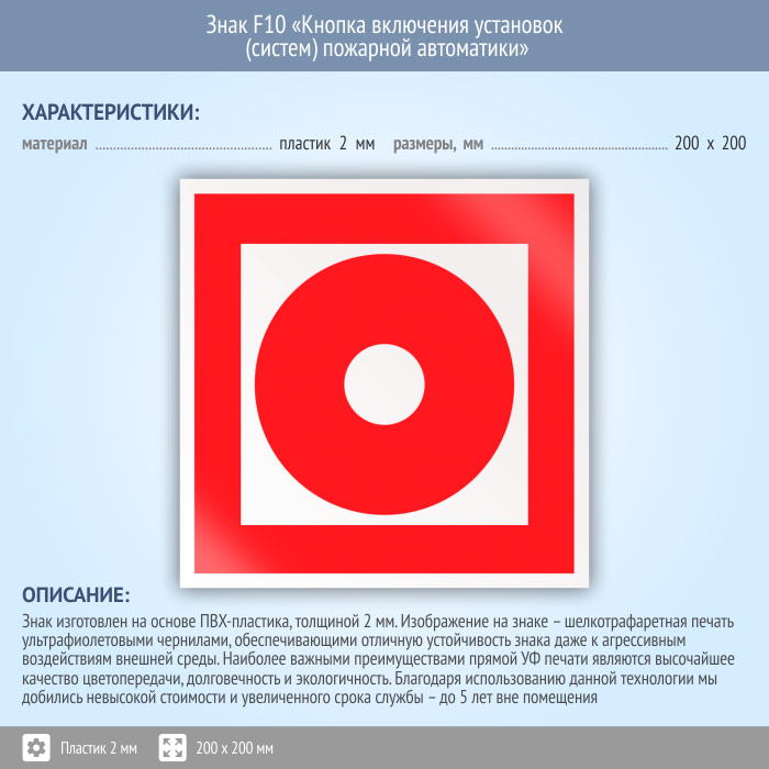 Знак F10 «Кнопка включения установок (систем) пожарной автоматики» (пластик, 200х200 мм) в Альметьевске купить