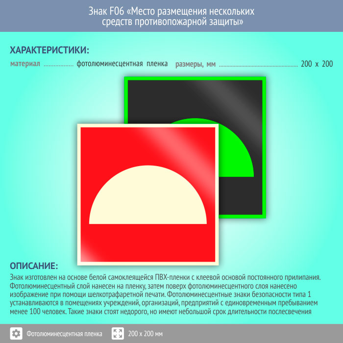 Знак F06 «Место размещения нескольких средств противопожарной защиты» (фотолюминесцентная пленка, 200х200 мм) в Альметьевске купить