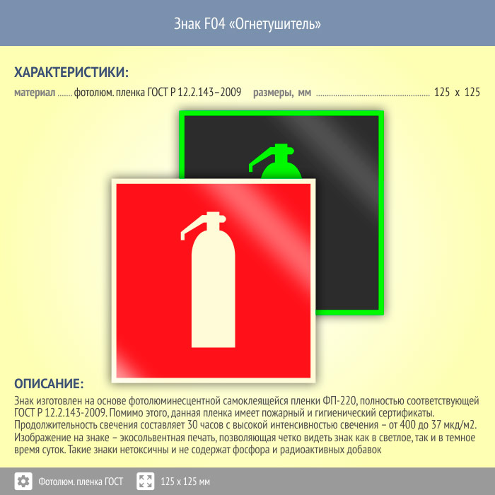 Знак F04 «Огнетушитель» (фотолюминесцентная пленка ГОСТ 34428-2018, 125х125 мм) в Альметьевске купить