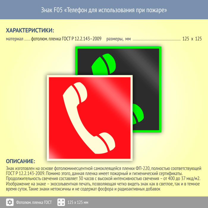 Знак F05 «Телефон для использования при пожаре (в том числе телефон прямой связи с пожарной охраной)» (фотолюминесцентная пленка ГОСТ 34428-2018, 125х125 мм) в Альметьевске купить