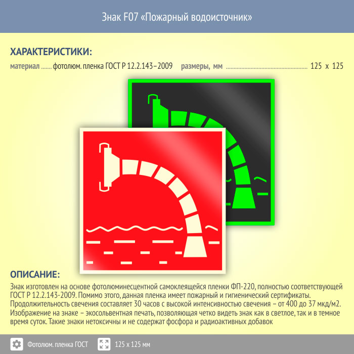 Знак F07 «Пожарный водоисточник» (фотолюминесцентная пленка ГОСТ 34428-2018, 125х125 мм) в Альметьевске купить