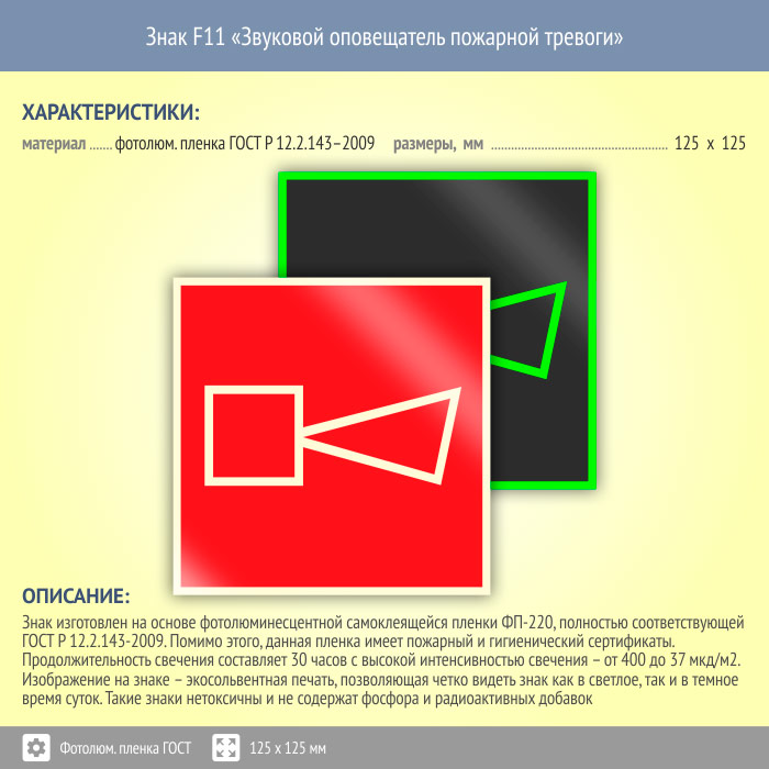 Знак F11 «Звуковой оповещатель пожарной тревоги» (фотолюминесцентная пленка ГОСТ 34428-2018, 125х125 мм) в Альметьевске купить