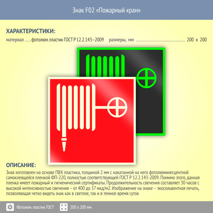 Знак F02 «Пожарный кран» (фотолюминесцентный пластик ГОСТ 34428-2018, 200х200 мм) в Альметьевске купить