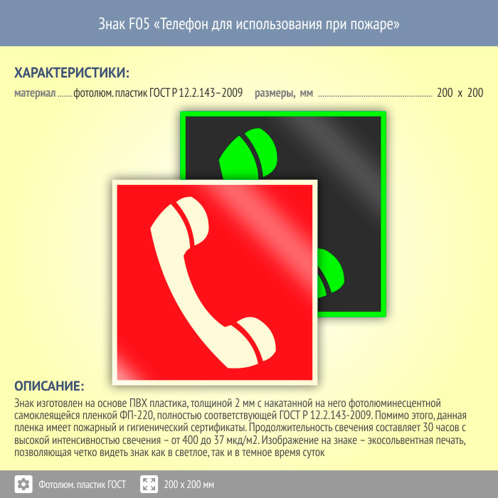 Знак F05 «Телефон для использования при пожаре (в том числе телефон прямой связи с пожарной охраной)» (фотолюминесцентный пластик ГОСТ 34428-2018, 200х200 мм) в Альметьевске купить