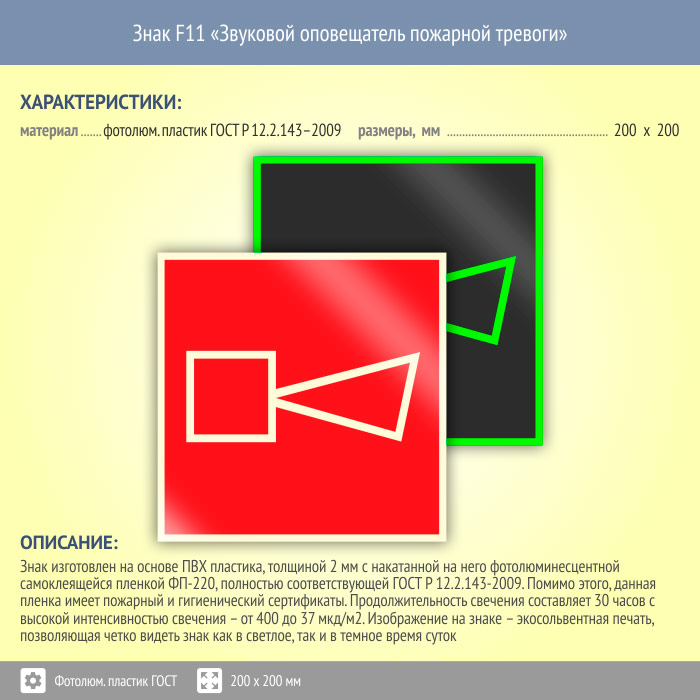 Знак F11 «Звуковой оповещатель пожарной тревоги» (фотолюминесцентный пластик ГОСТ 34428-2018, 200х200 мм) в Альметьевске купить