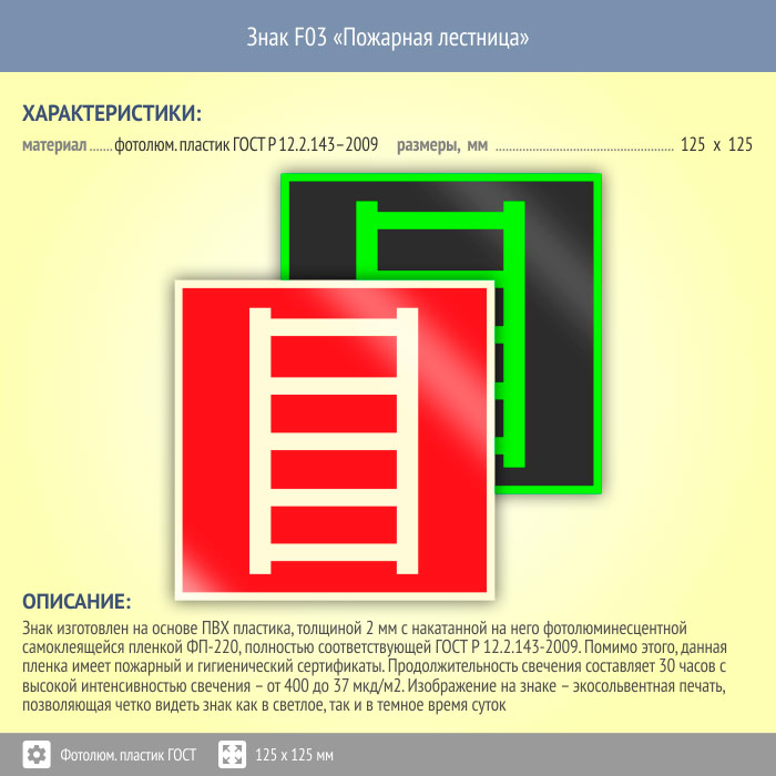 Знак F03 «Пожарная лестница» (фотолюминесцентный пластик ГОСТ 34428-2018, 125х125 мм) в Альметьевске купить
