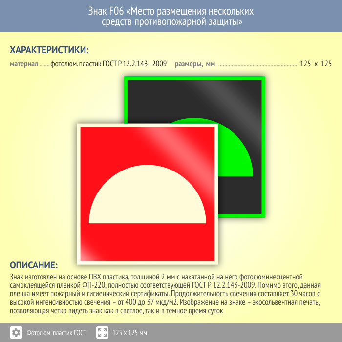 Знак F06 «Место размещения нескольких средств противопожарной защиты» (фотолюминесцентный пластик ГОСТ 34428-2018, 125х125 мм) в Альметьевске купить