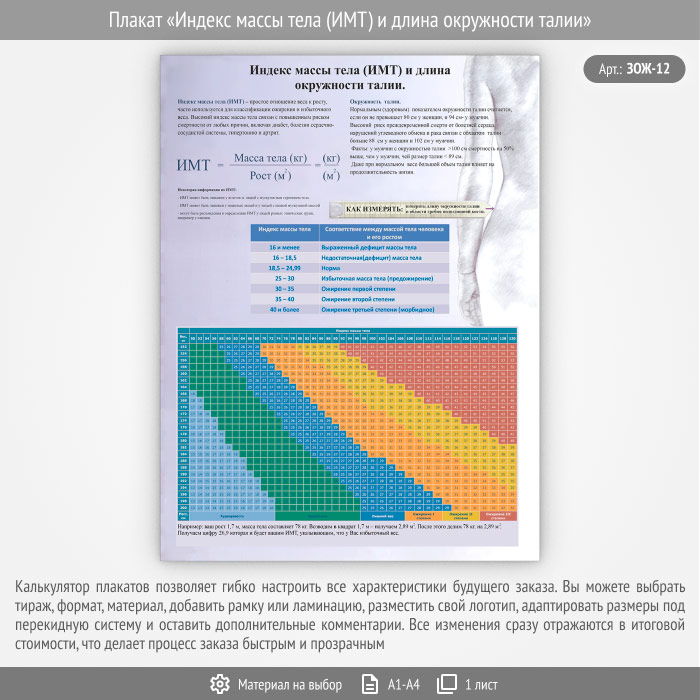 Плакат «Индекс массы тела (ИМТ) и длина окружности талии» (ЗОЖ-12, 1 лист) в Альметьевске купить